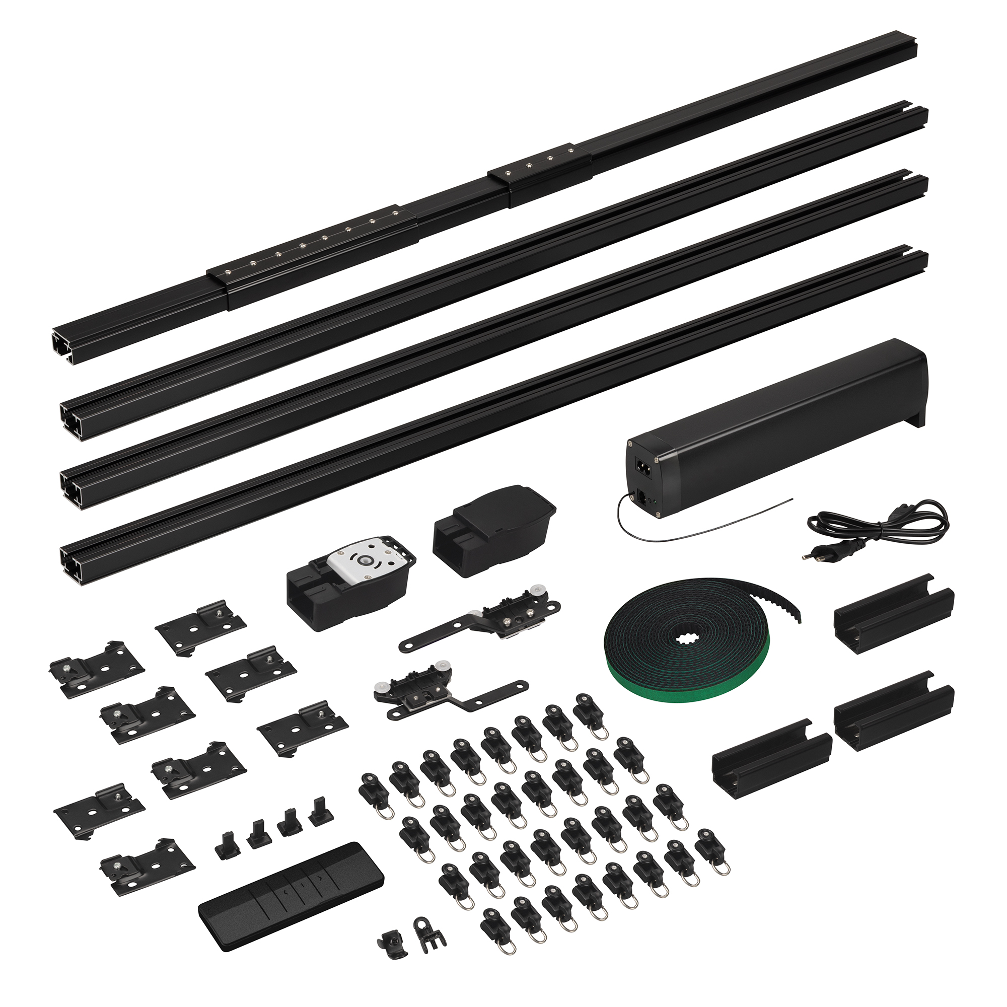 1 мотор, 1 пульт дистанционного управления, алюминиевый профиль 1,6 мм (1м - 3шт, 0.5м - 1шт, 0.2м - 2шт., 0.1м - 1 шт.), 3 соединителя 10 см, 1 соединитель 20 см, 1 переходник 5 см, 2 шкива, 2 пряжки ремня, 2 направляющих бегунка, ремень 8,4 м, 32 бегунка, 2 фиксатора, 8 кронштейнов, 1 зажим на ремень