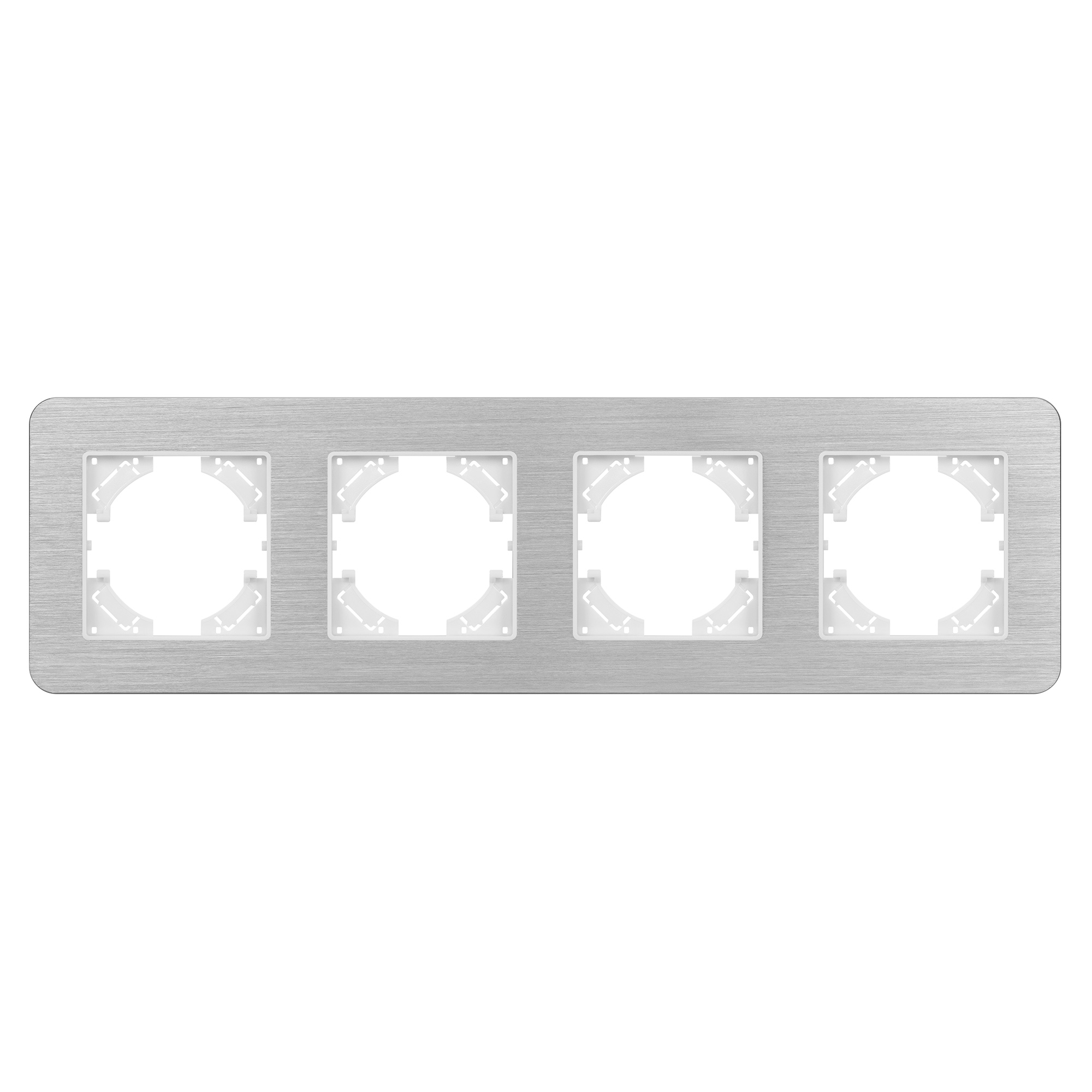 Рамка алюминиевая на 4 поста, под встраиваемый механизм. Цвет - серебристый. Среднего уровня герметичности IP20. Ориентация монтажа - горизонтальная (основным ориентиром служат посадочные выступы для накладки механизма).