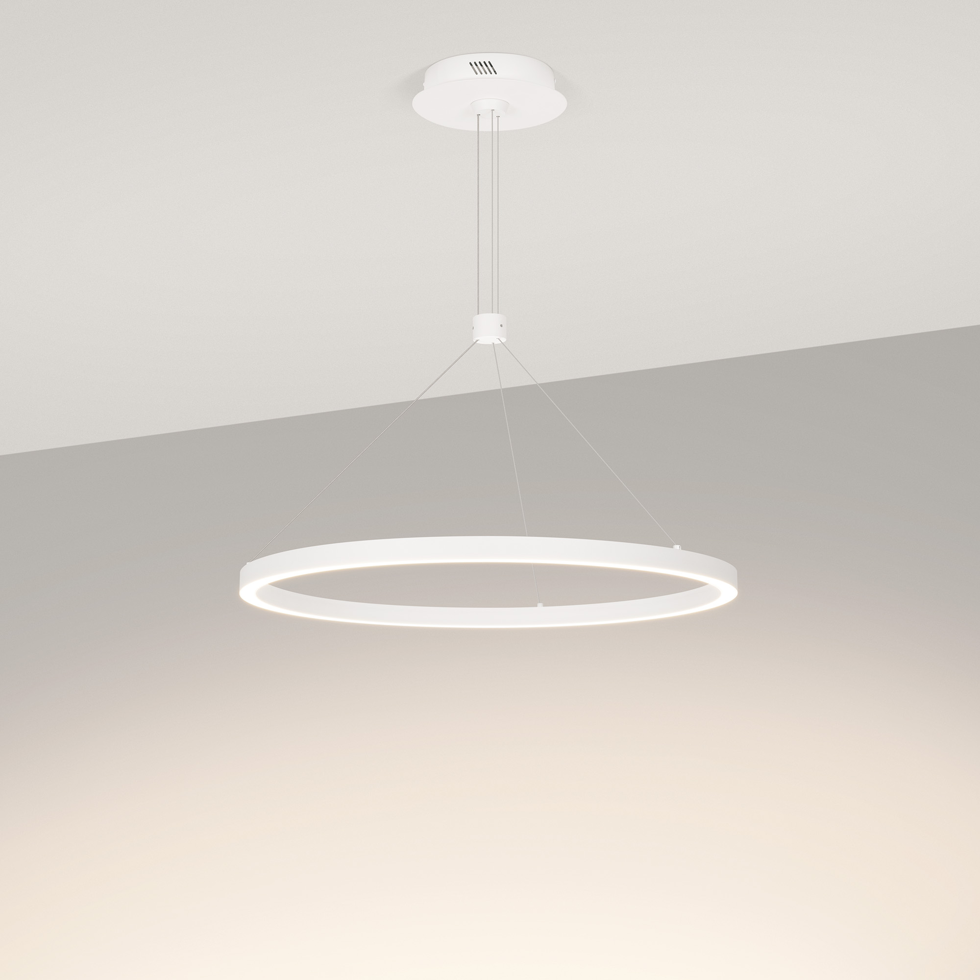 Подвесной светильник. Мощность 36 Вт, св. поток 2050 лм, 57 лм/Вт, дневной 4000 K, CRI>90, угол 120°, напряжение питания 230 В. Белый круглый корпус из алюминия, экран силикон, степень защиты IP20. Размер: диаметр 600 мм, высота 25 мм, ширина профиля 25 мм, размер чаши: диаметр 170 мм, высота 40 мм. Монтаж подвесной, длина подвеса 1200мм. Драйвер 33-40 В, 900 мА. Пульсация <5%.